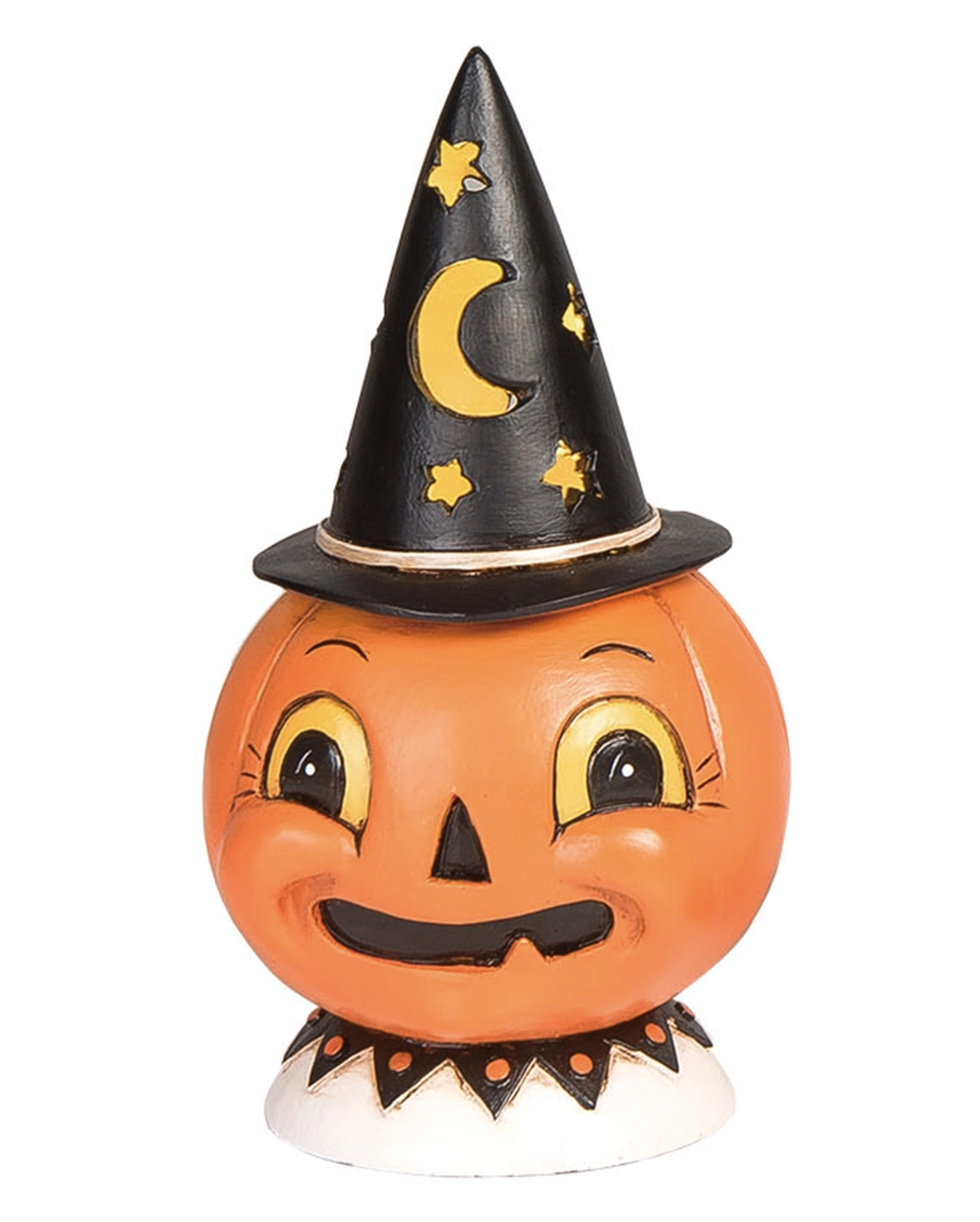 Ein Traum für Nostalgiker und ein Fest für Liebhaber feiner Deko Kunstwerke. Verschenke unseren Johanna Parker Kürbis mit leuchtendem Hexenhut oder gönne dir selbst den liebevollen Kürbis, der sich einen schwarzen spitzen Hexenhut auf den Kopf gesetzt hat und uns mit einem Lächeln begrüßt. Vom schwarz-orangefarbenen Kragen über die freundlichen Augen bis zum schwarzen Hut wurde jedes Detail sorgsam von Hand aufgetragen.