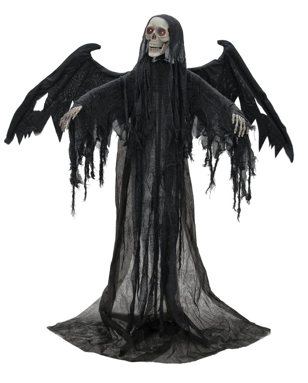 Du willst neue Maßstäbe in Sachen Halloween Dekoration setzen? Dann lade unseren schwarzen Pestengel mit Bewegung, Sound & Licht zu dir ein. Diese gruselige Deko Figur bringt selbst den stärksten Partygast zum Zittern. Mal sehen, wer sich als erstes ins Höschen macht, wenn der schaurige Skelett mit den Flügeln und dem Fetzenumhang mit den Flügeln schlägt und gruselige Laute von sich gibt. Seine Augen leuchten glutrot. Unheimlichere Geisterbahn Animatronics hat man selten gesehen.